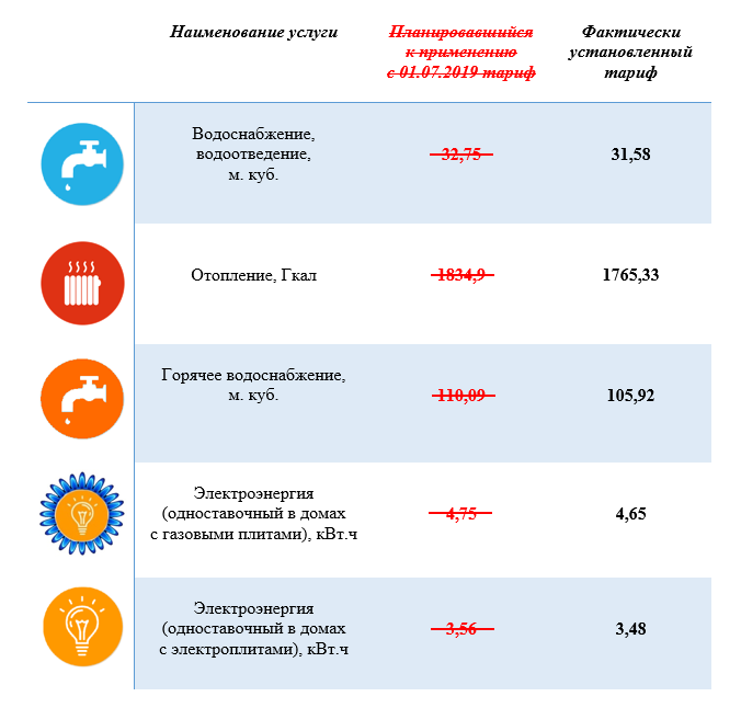 Таким образом, по решению Правительства Санкт-Петербурга с 1 июля 2019 года темпы роста тарифов на коммунальные услуги снижены с 4,3 % до 0,4 %. Для расчета размера платы за основные коммунальные услуги установлены следующие тарифы: